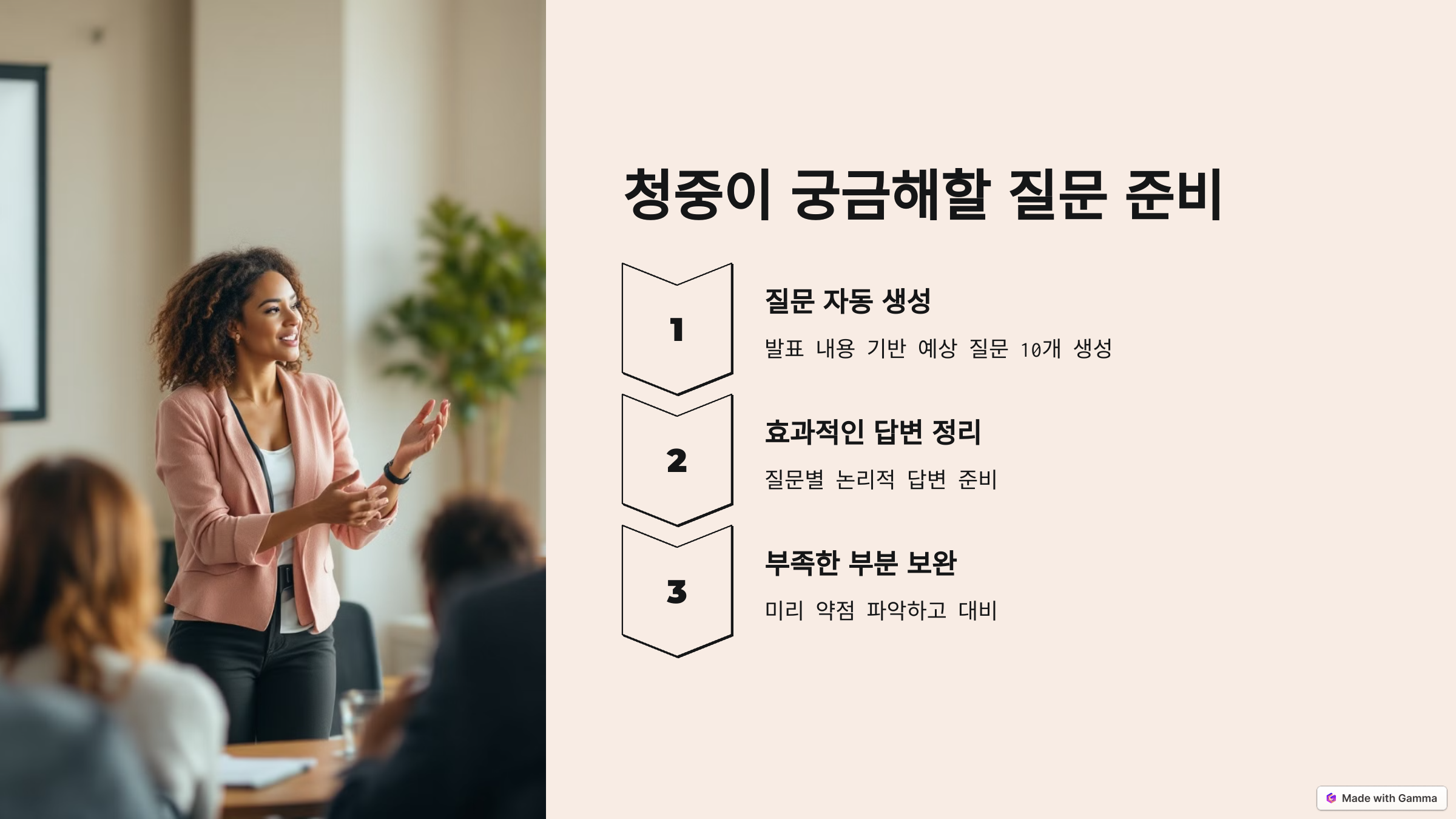발표 중 예상치 못한 질문이 나오면 당황할 수 있습니다. 미리 질문을 정리하고 준비하면 완벽한 Q&A가 가능합니다!
